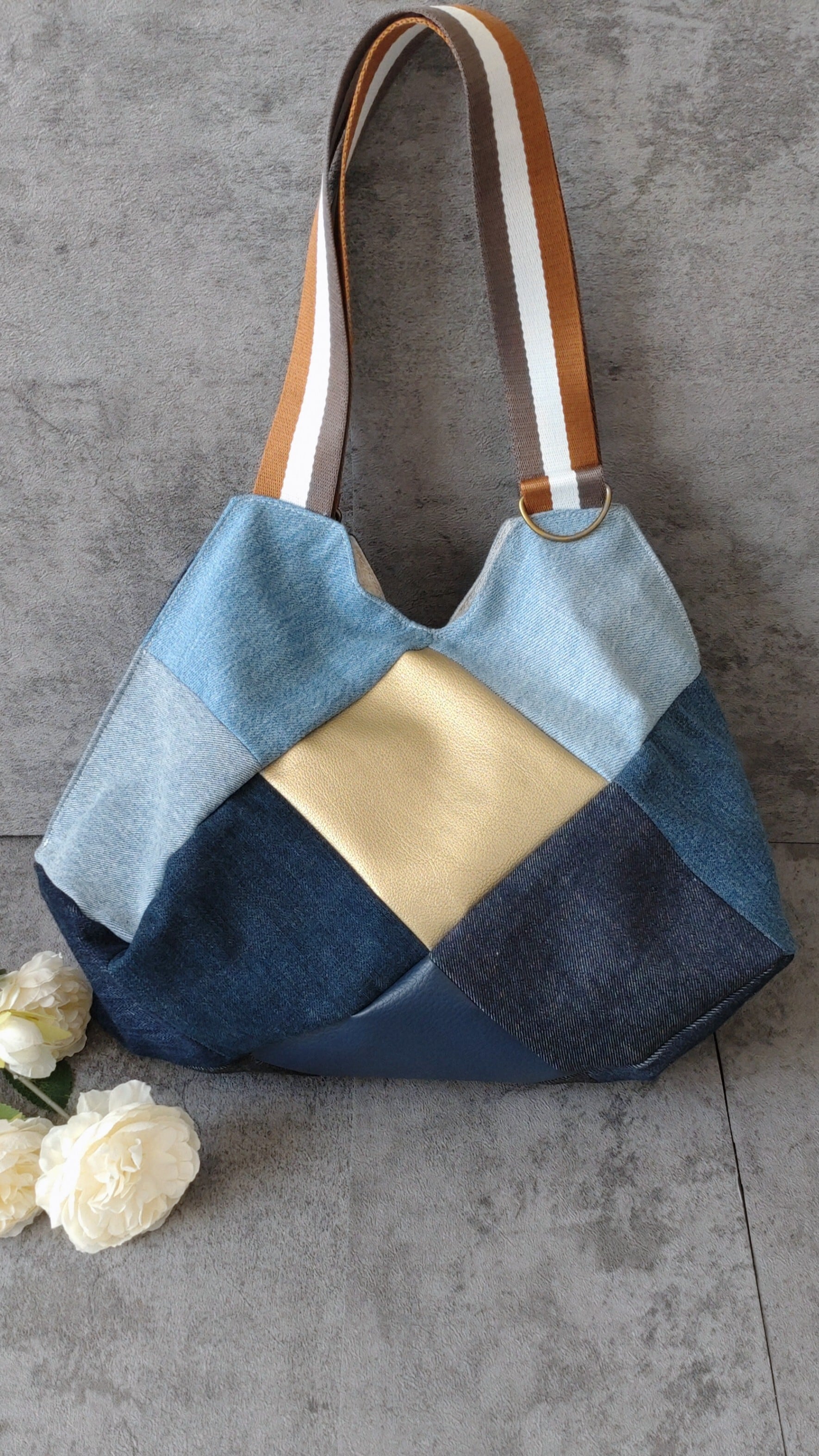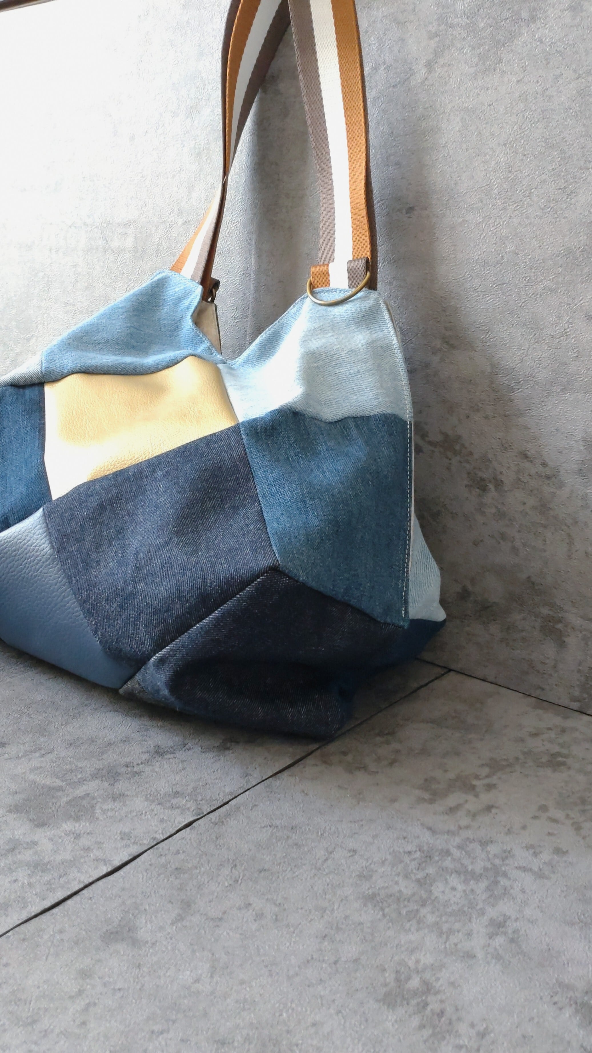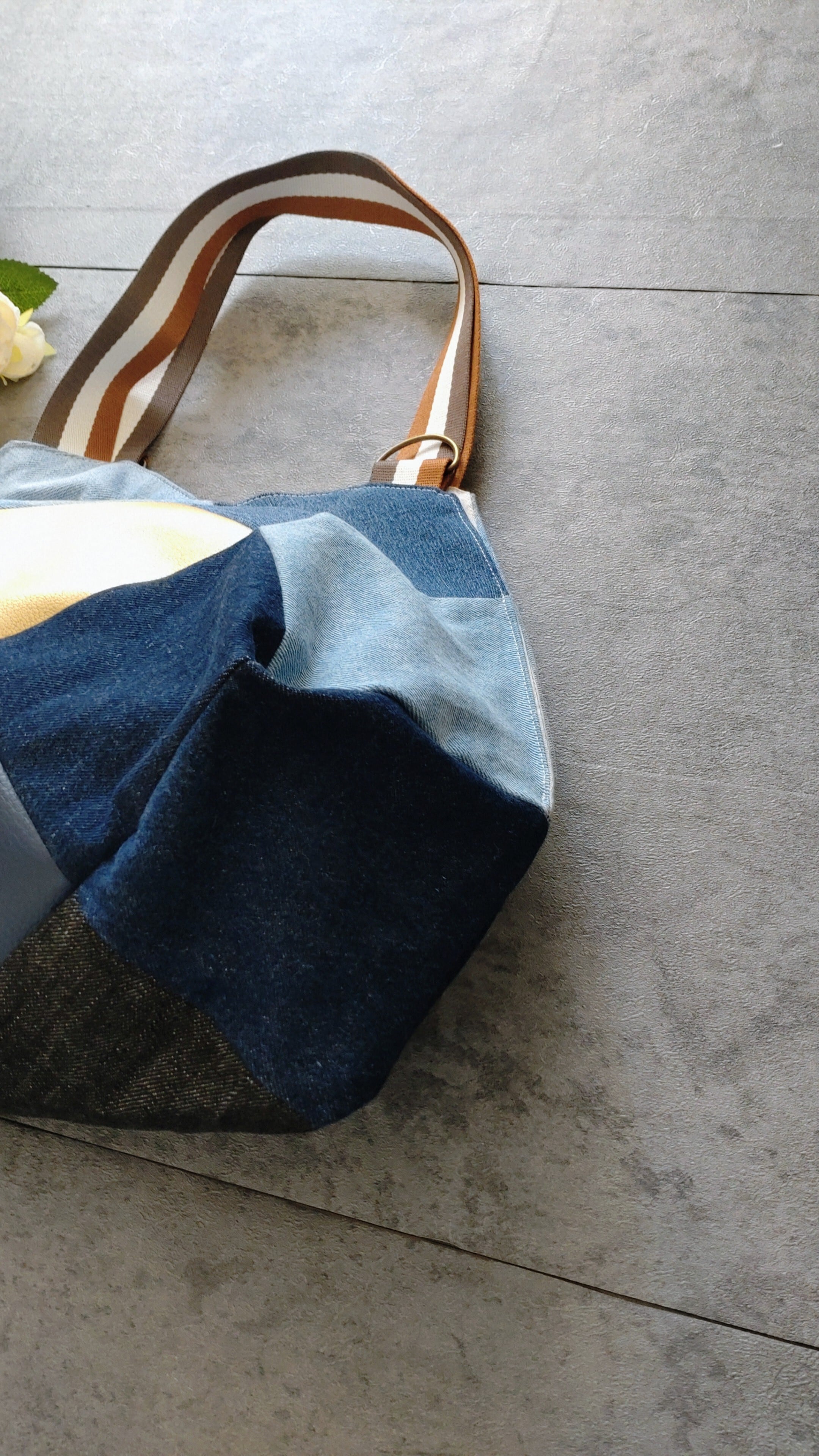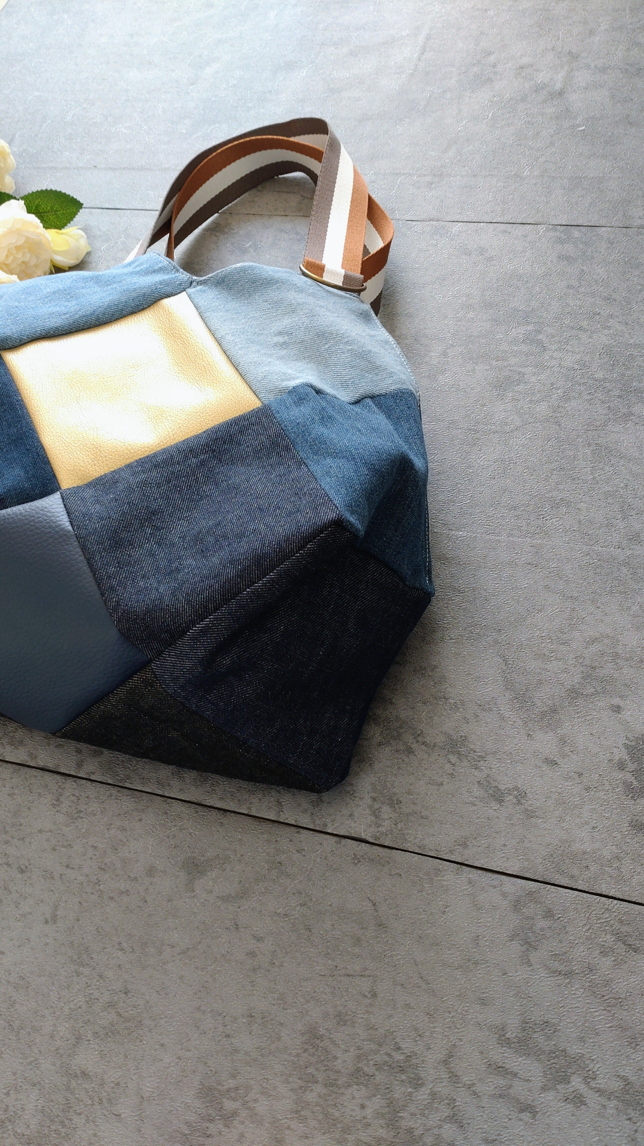 #デニムトートバッグ #パッチワークバッグ #リメイクデニム #ハンドメイドバッグ #大容量トート #デニム雑貨 #お出かけバッグ