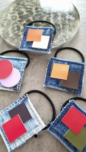 リメイクデニム×フェイクレザー スクエアヘアゴム